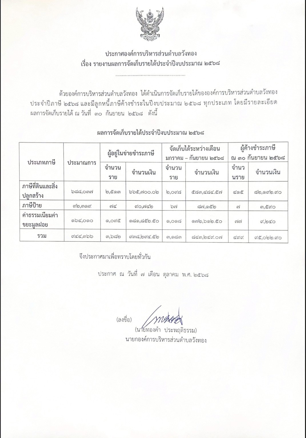 รายงานผลการจัดเก็บรายได้ ประจำปีงบประมาณ 2568 |